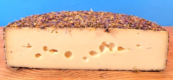 | Der Almblütenkäse ist ein aromatischer Schnittkäse aus Alpenmilch, der mit einer essbaren Rinde aus einer sorgfältig abgestimmten Mischung von Almkräutern und Blüten verfeinert wird. Diese Blütenkruste verleiht dem Käse nicht nur eine optisch ansprechende, farbenfrohe Erscheinung, sondern auch ein einzigartiges, würzig-blumiges Aroma. Verfeinert mit einer Mischung aus Ringelblumen, Kornblumen, Rosenblüten und Almkräutern. 48% Fett i. Tr. Käse würde mit thermisierter Milch hergestellt. |